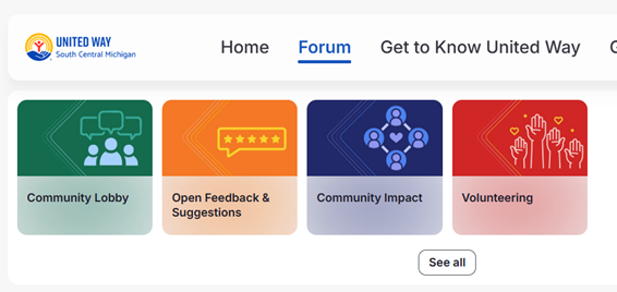 Moving along, groups is next. Check out our current list of groups to see if there’s any that fit your interest or connection to United Way. If so, click "Apply to Join," and we'll get you approved.